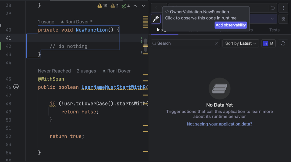 Digma makes it easy to add additional observability coverage to any location. Placing the cursor inside any method you can click on the Observability icon in the Insights side panel to quickly add an annotation that will include its data in the traces.