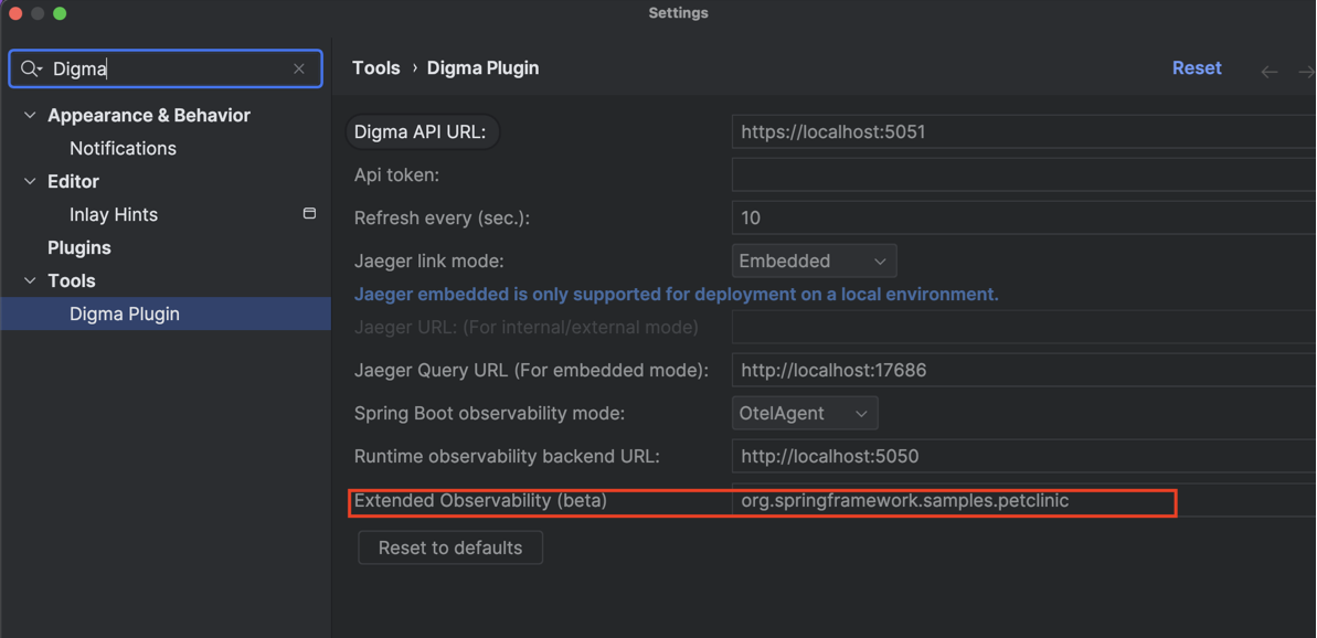 To enable `Extended Observability` Open the Digma plugin settings page and type in the name of your application package under the `Extended Observability (beta)` property.
